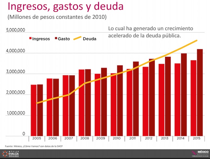futuro”.El pago de intereses de la deuda pública, que podría alcanzar más de 568 mil millones de pesos en 2017 (101.7 por ciento), cifra superior al monto de gasto en inversión, advierte la organización México Evalúa y señala que el Presupuesto 2017 no tiene las mejores decisiones en materia fiscal lo que derivirá una falta de crecimiento económico en el país.Las mejores decisiones en materia fiscal no se han tomado y “se está cocinando una receta de anticrecimiento”. México invertirá menos en capital en 2016-2017 que lo registrado en 1939, con 2.8 por ciento del PIB, dijeron hoy México Evalúa y México, ¿Cómo Vamos?, dos think tanks mexicanos.Las organizaciones mencionaron que para promover el crecimiento económico, el gobierno debe privilegiar el gasto en inversión física y en capital humano. Sin embargo, el Proyecto de Egresos de la Federación para 2017 prevé aumentar 23.5 por ciento (86 mil 742 millones de pesos) el gasto de Servicios Personales (sueldos y prestaciones de funcionarios públicos) y recortar la inversión en obra pública del Gobierno federal un 21.2 por ciento (19 mil 278 millones de pesos) frente a 2012.Otro reto que enfrentan las finanzas públicas es el pago de intereses de la deuda pública, que podría alcanzar más de 568 mil millones de pesos en 2017 (101.7 por ciento), cifra superior al monto de gasto en inversión.Para evitar que el endeudamiento siga aumentando de forma descontrolada (subió 10 puntos porcentuales del PIB en cuatro años), ambas organizaciones a partidistas recomendaron:1. Que la ley exija que el Poder Ejecutivo especifique cómo usará los recursos al solicitar deuda.Valeria Moy, de México, ¿Cómo Vamos?, expuso que debido a la crisis financiera de 2008, el gobierno debió gastar y endeudarse más, “pero en los siguientes años no sólo no se corrigió, sino que empeoró”.Moy agregó que se ha acumulado tanta deuda “que los intereses nos están comiendo. En 2017 se gastará más para pagarlos que en inversión; no se iniciarán nuevos proyectos”.2. Que la ley federal se base en la Ley de Disciplina Financiera de Entidades y Municipios para establecer los requisitos para que el gobierno federal pueda adquirir deuda, así como un límite permitido al déficit de las finanzas públicas.