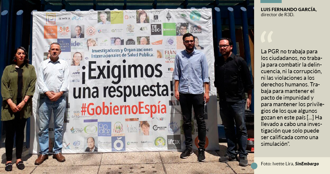 Grupos civiles organizados exigieron a la Procuraduría General de la República informar sobre los avances en la investigación del espionaje del que fueron objeto, pues acusan que la dependencia federal no ha hecho su trabajo y, además, no tiene interés en de dar con los responsables de este espionaje.El Gobierno mexicano espió entre enero de 2015 y julio de 2016 a defensores de derechos humanos, periodistas y activistas a través del malware “Pegasus”, que en teoría sólo debe ser usado para investigar a criminales y terroristas, reveló el diario estadounidense The New York Times el 20 de junio de 2017.Esa misma tarde, el Gobierno de México respondió con una escueta hoja sin membrete a periódico neoyorquino. Y, entonces, sólo pidió a los afectados denunciar ante la Procuraduría General de la República. Además, dijo sin dar más explicación, que había pruebas sobre estos señalamientos. Organizaciones de la sociedad civil exigen a la Procuraduría General de la República (PGR) informar sobre los avances en la investigación del espionaje del que fueron objeto dos activistas y un investigador en temas de salud el año pasado.El Poder del Consumidor, la Red Contrapeso, Red en Defensa de los Derechos Digitales (R3D) y SocialTIC acusaron que la dependencia federal no ha investigado, ya que es el principal sospechoso de haber utilizado el malware “Pegasus” para espiar a los activistas Alejandro Calvillo Unna, de EPC y Luis Manuel Encarnación, de ContraPESO, además del investigador Simón Barquera, del Instituto Nacional de Salud Pública (INSP), quienes han impulsado el aumento del impuesto en las bebidas azucaradas.“Estamos pidiendo a la PGR que dé a conocer los avances de la investigación […] No hay interés de dar con los responsables de este espionaje”, acusó uno de los blancos de espionaje: Alejandro Calvillo, director de El Poder del Consumidor (EPC).En su oportunidad, Luis Fernando García, de la R3D, aseguró que la PGR no lleva a cabo investigación alguna al respecto y manifestó que sólo se trata de una “simulación”, por lo que calificó “es una institución de pacotilla”.“La PGR no trabaja para los ciudadanos, no trabaja para combatir la delincuencia, ni la corrupción, ni las violaciones a los derechos humanos. Trabaja para mantener el pacto de impunidad y para mantener los privilegios de los que algunos gozan en este país […] Ha llevado a cabo una investigación que solo puede ser calificada como una simulación”, recriminó a las afueras de la dependencia ubicada sobre la Avenida Reforma.
