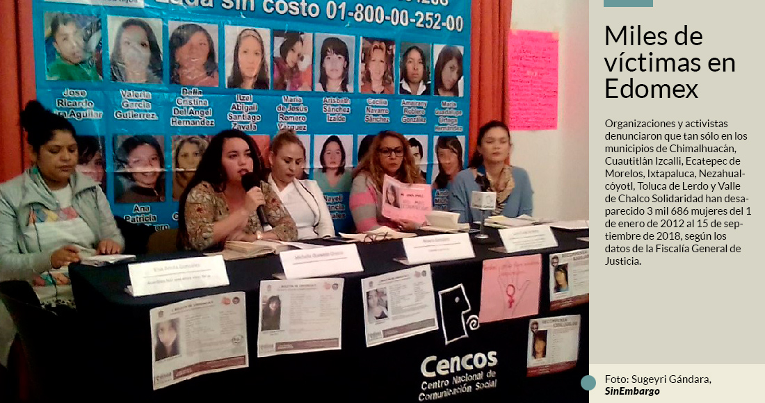 El documento detalla que tan sólo en los municipios de Chimalhuacán, Cuautitlán Izcalli, Ecatepec de Morelos, Ixtapaluca, Nezahualcóyotl, Toluca de Lerdo y Valle de Chalco Solidaridad han desaparecido 3 mil 686 mujeres del 1 de enero de 2012 al 15 de septiembre de 2018, según los datos de la Fiscalía General de Justicia. La mayoría de las mujeres reportadas como no localizadas tiene entre 15 a 17 y de 21 a 29 años.