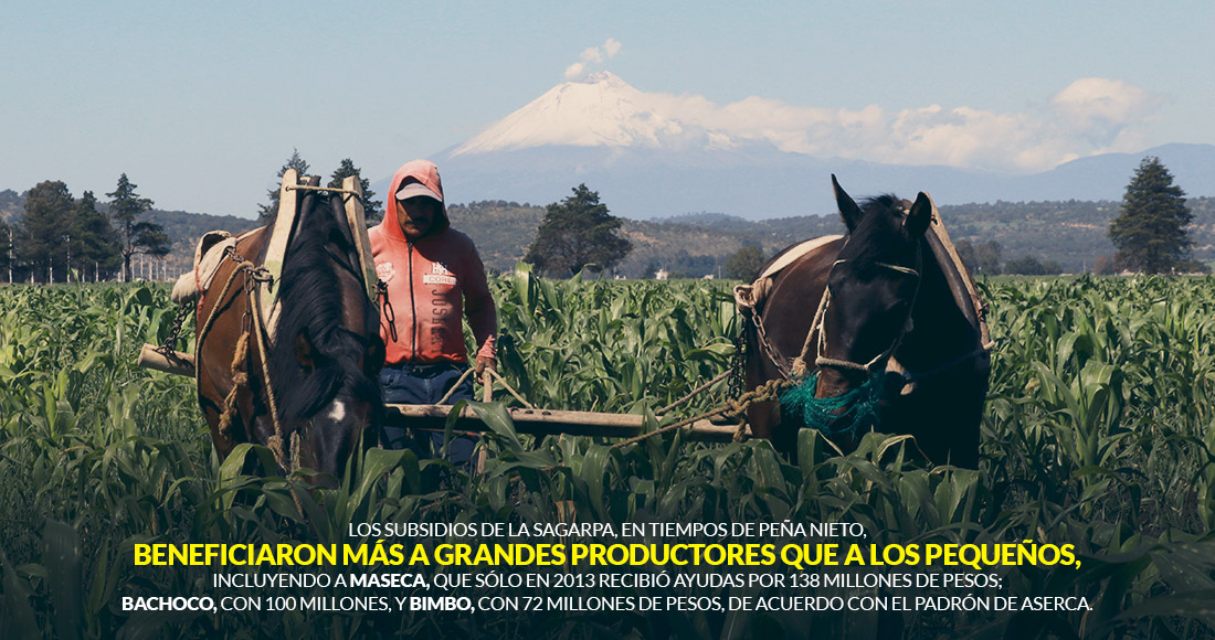La organización Fundar mostró, con cifras oficiales de la entonces Sagarpa, que los grandes productores agropecuarios se beneficiaron de los subsidios otorgados más que a los pequeños y medianos campesinos y ganaderos, a pesar de que ellos representan el 39 por ciento de la producción nacional.